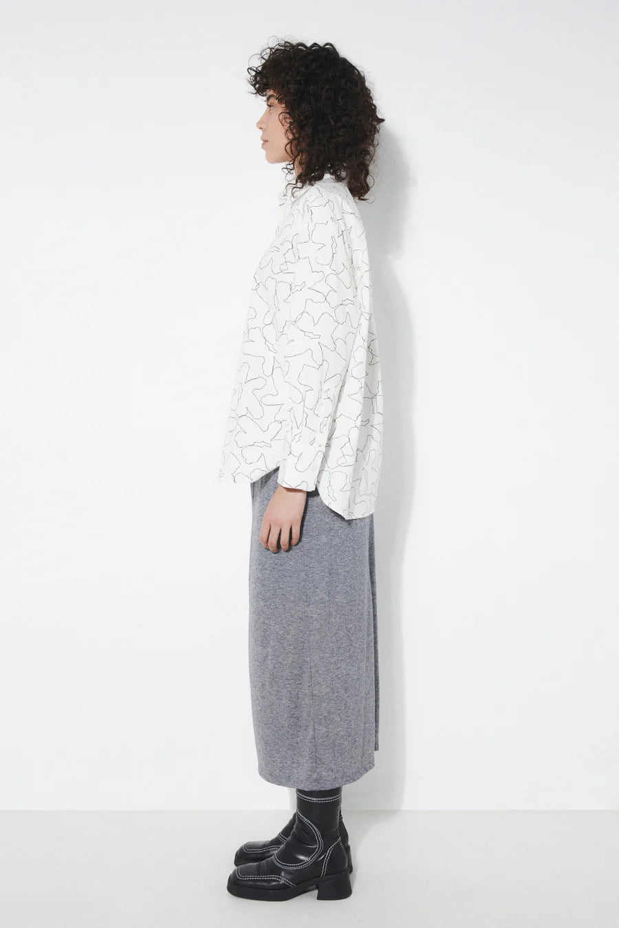 The Brit Shirt is a printed poplin cotton shirt. Lapel collar and long sleeves with cuffs and buttons. Asymmetric hem with side slits. Front button closure.