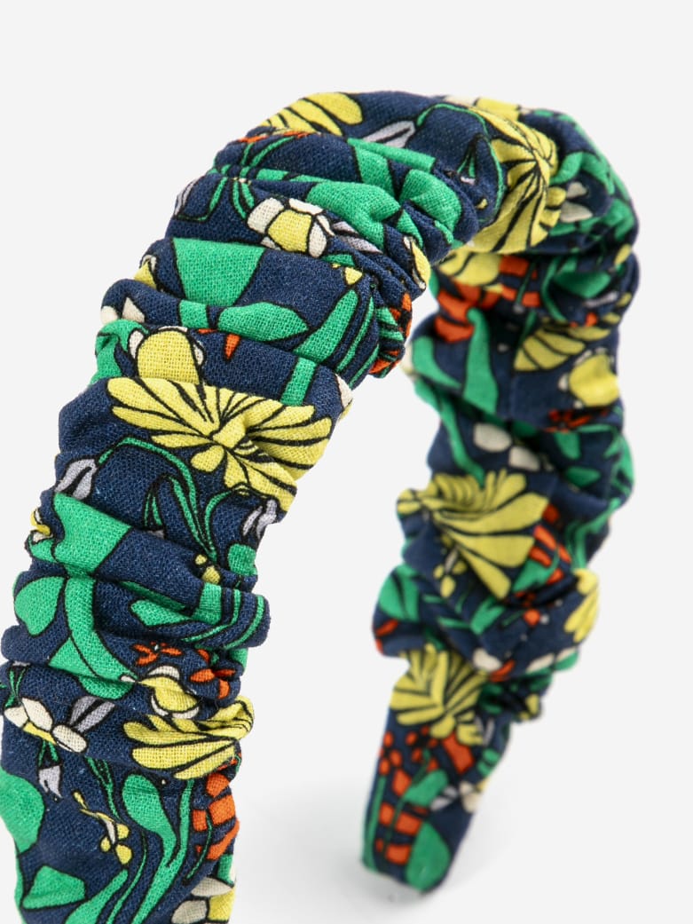 A stylish headband featuring a floral print garden pattern on navy fabric. The ruched fabric creates a look perfect for adding something special to a casual outfit or to top off a playful party look.