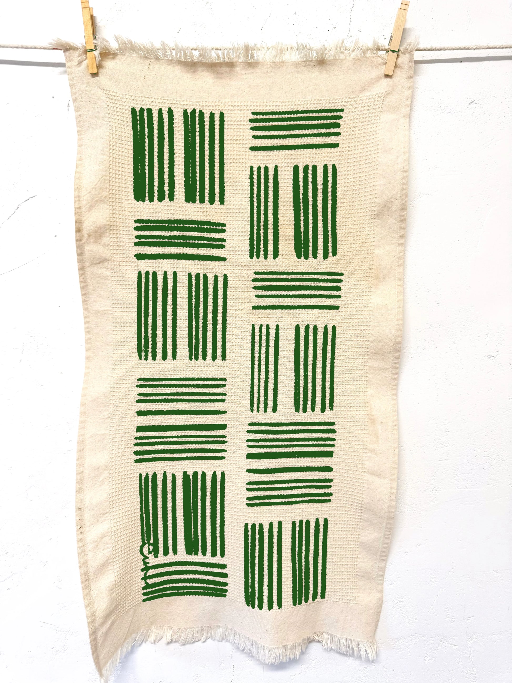 Set of 3, hand-woven waffle cotton hand towels/tea towels hand printed with Erin Flett patterns. Each pattern is hand-drawn and silk screen printed with water-based solvent-free inks with a hem and fringe finish. Each hand towel is fast-drying and has high absorbency. A perfect pop of color and pattern for your kitchen or bathroom to give or to get.