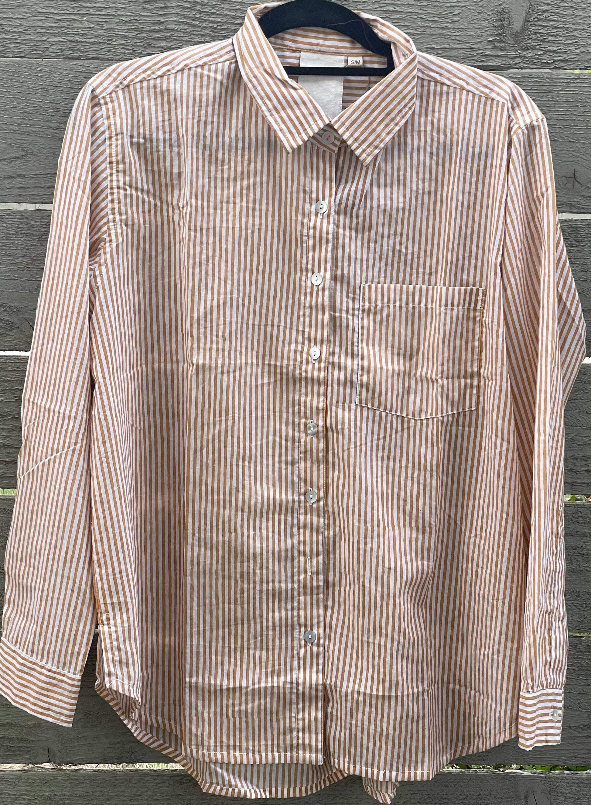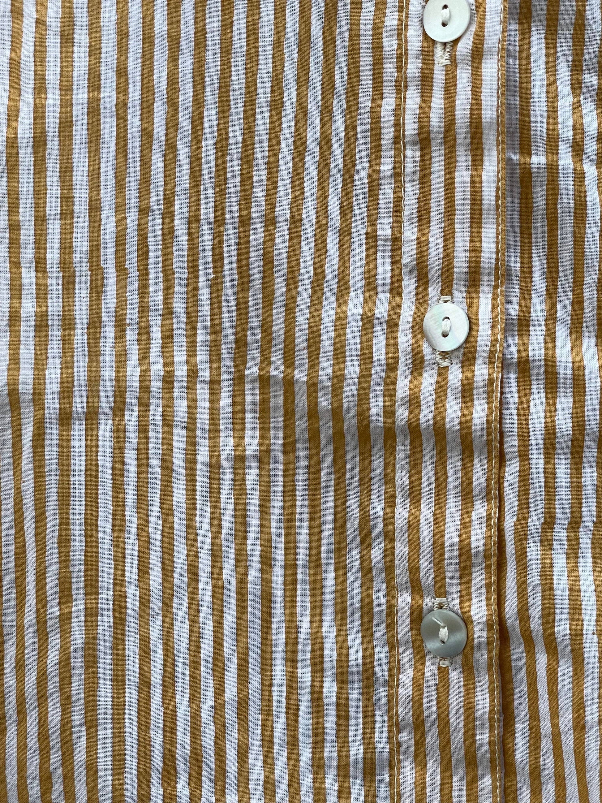 The good boyfriend long sleeve button down shirt is a comfortable and effortlessly cool wardrobe staple with a sustainable story. From its origin of GOTS certified organic cotton in natural fields, to the hand loom processing, artisan crafted block from carved wood to hand stamp the stripe print, hand construction and sewing of garment; the entire lifecycle of production is sustainable and keeps the heritage of artisan practices alive. With its relaxed, modern fit, and casual silhouette, the good boyfriend shirt offers endless styling options and ways to wear this eco-fashionable favorite.