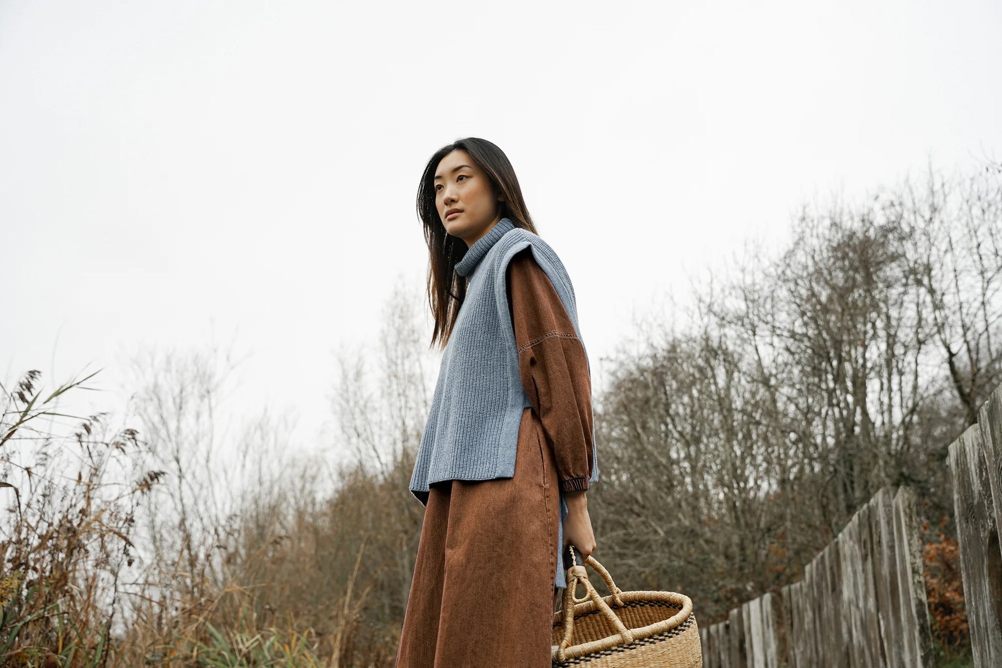 The Kanon is a knitted tabbard vest with a roll neck and adjustable ties at the sides.