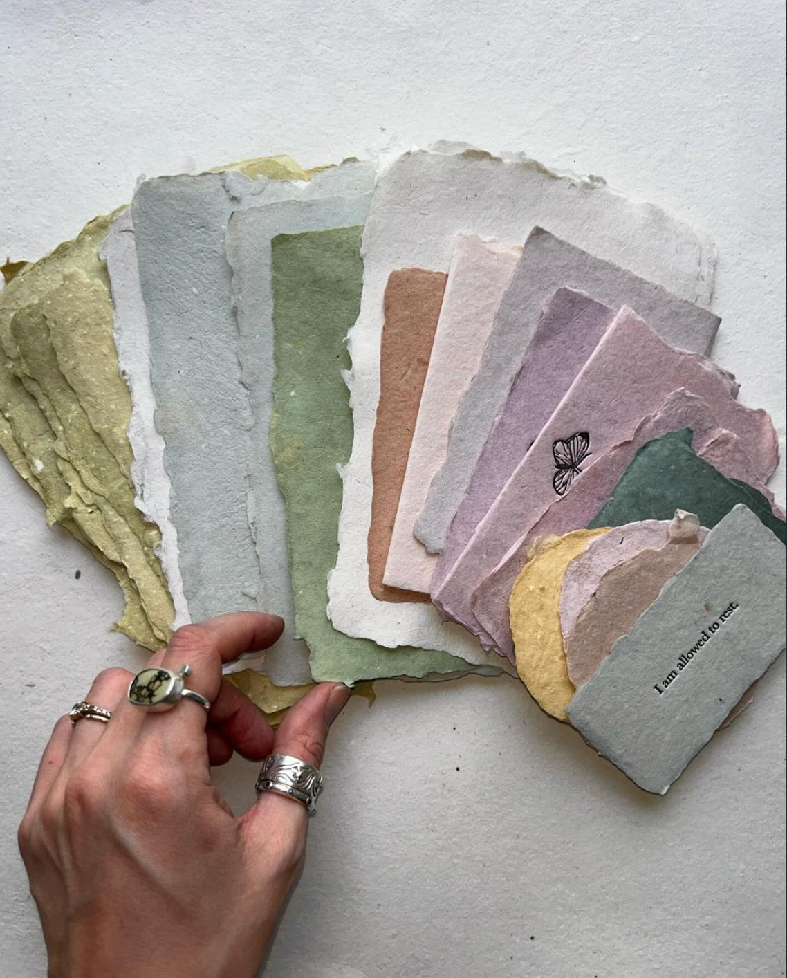 all cards, prints, and papers are made by hand using cotton and other natural fibers. all paper dyes are plant-based, non-toxic, and eco-friendly. made in small batches on a farm in California. farm to card