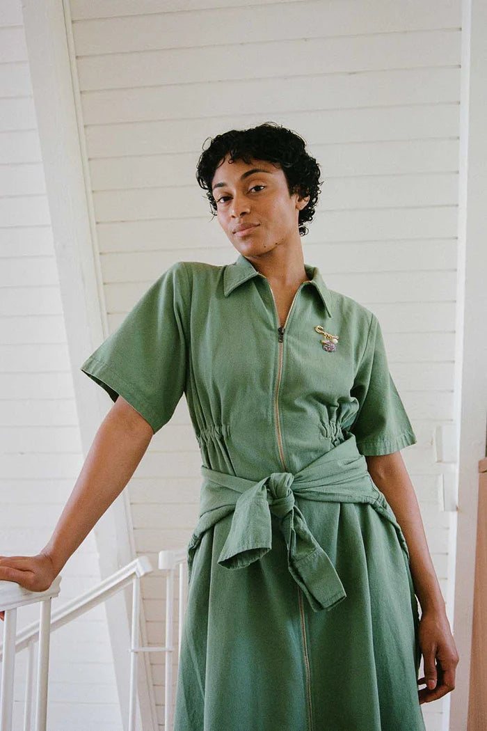 Our signature Utility Dress is now available in a longer length. This version also features oversized sleeves, a cinched elastic waist and full skirt for a flattering, comfortable fit. Featuring our exclusive artist collaboration print with Laura Burke.