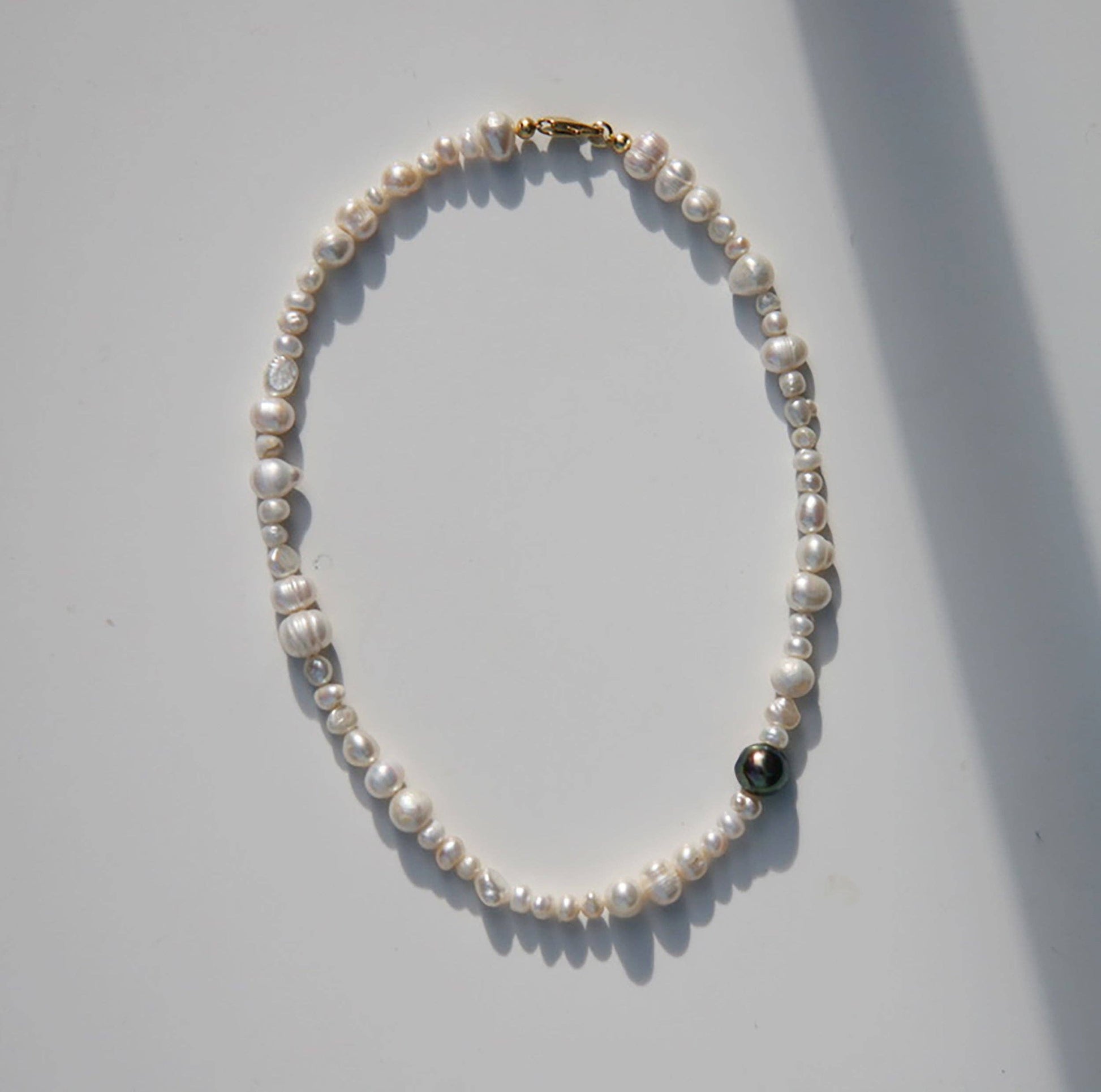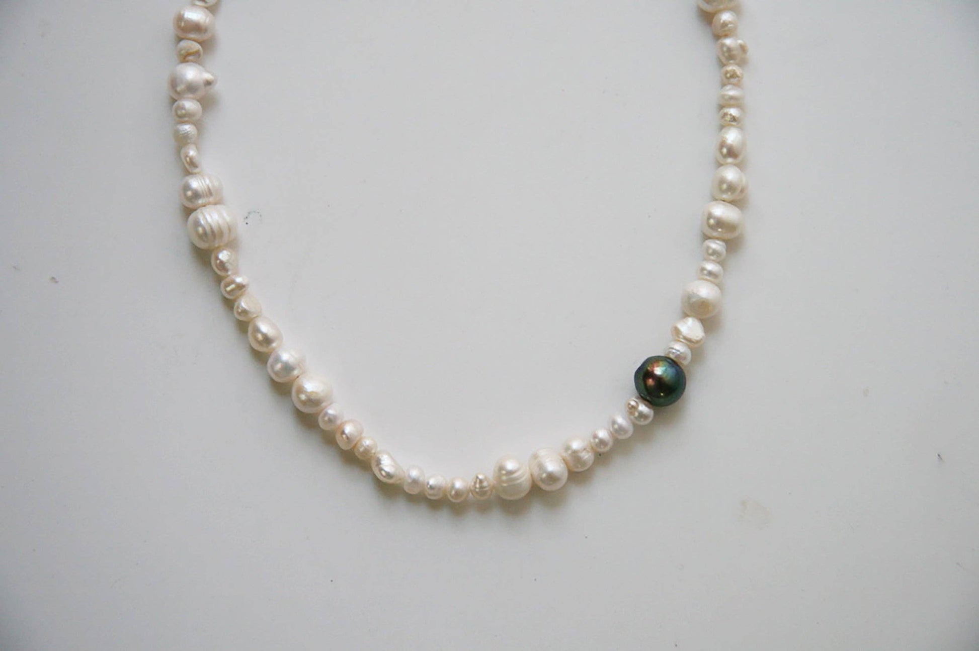 Mix of different sized freshwater and baroque pearls in an asymmetric pattern with one black peacock pearl.