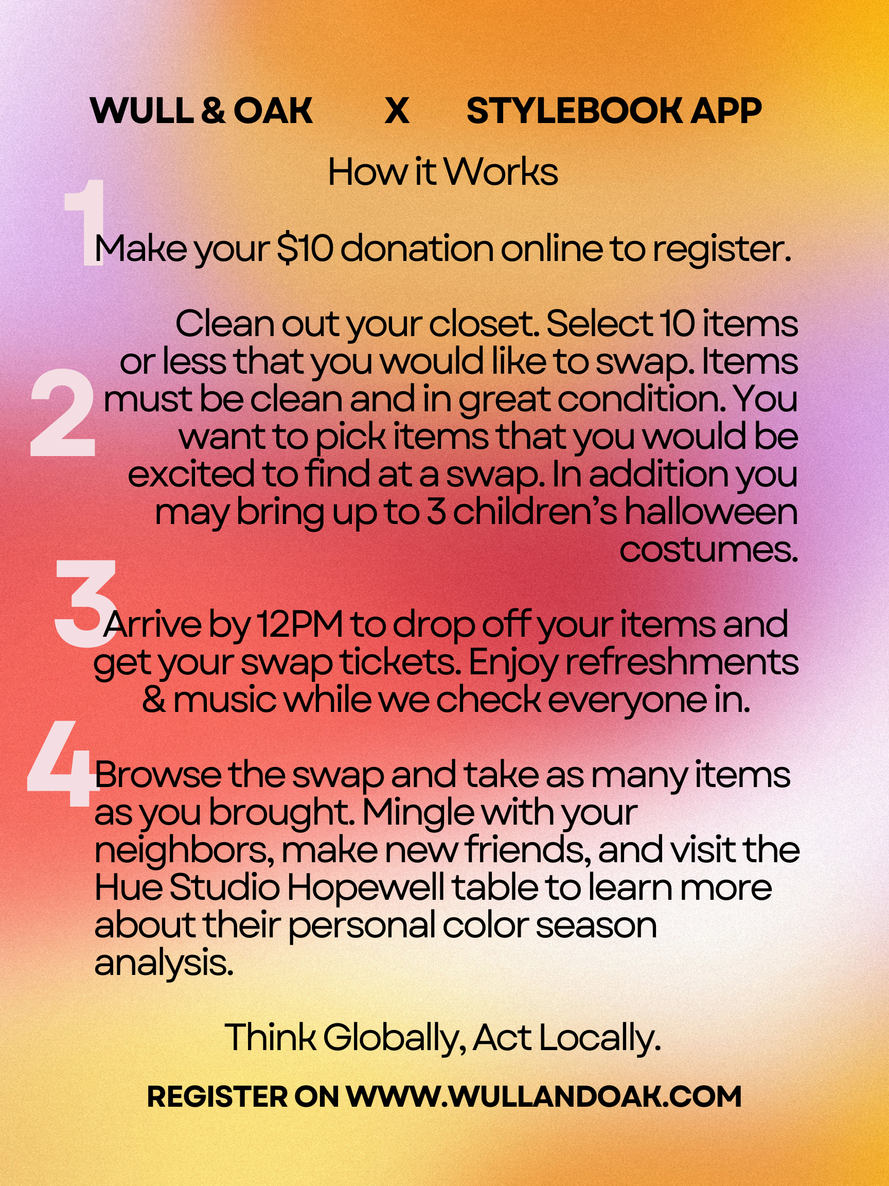 Join Wull & Oak and Stylebook for our Community Clothing Swap with music, small bites, ethical fashion and a good time! Do you have nice clothing pieces that never see the light of day because they no longer fit or just don’t fit your life? Don’t let them languish in the back of your closet - bring them to the swap! Your unworn clothes could be someone else’s wardrobe staple! This is a one-for-one swap, with a limit of 10 clothing items per person. Nearly new clothing only - bring what you would want to find! This year we are also allowing up to 3 children's halloween costumes per-person at the swap.