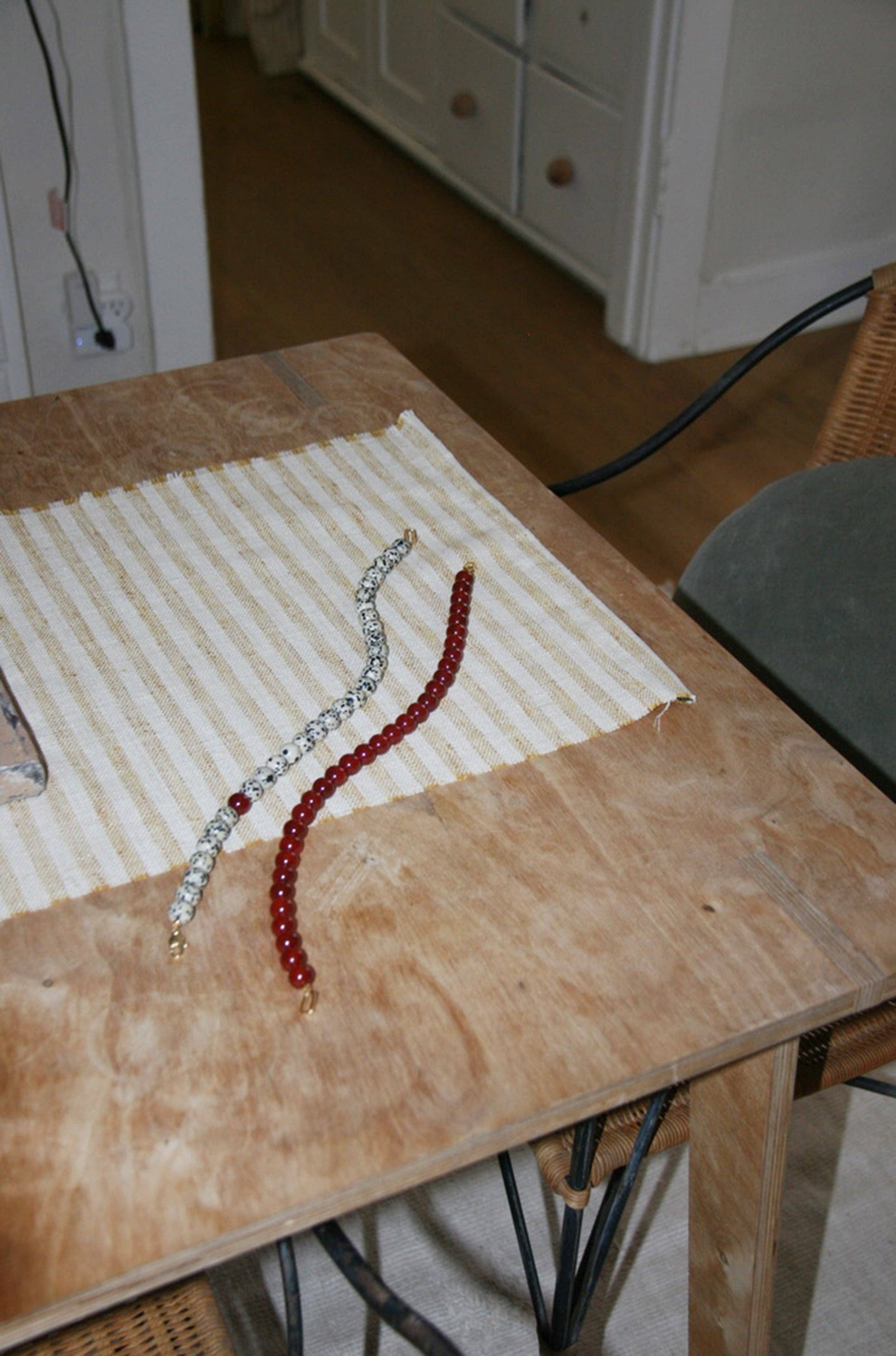 These Jumbo Dalmatian Jasper beads are paired with a single complimentary and off center Carnelian bead. A neutral color scheme with a subtle yet bold pop of color.