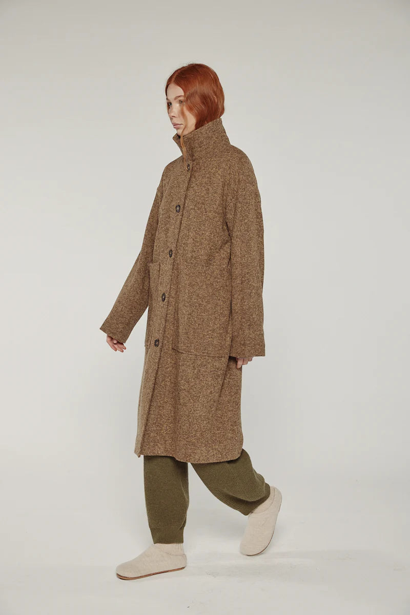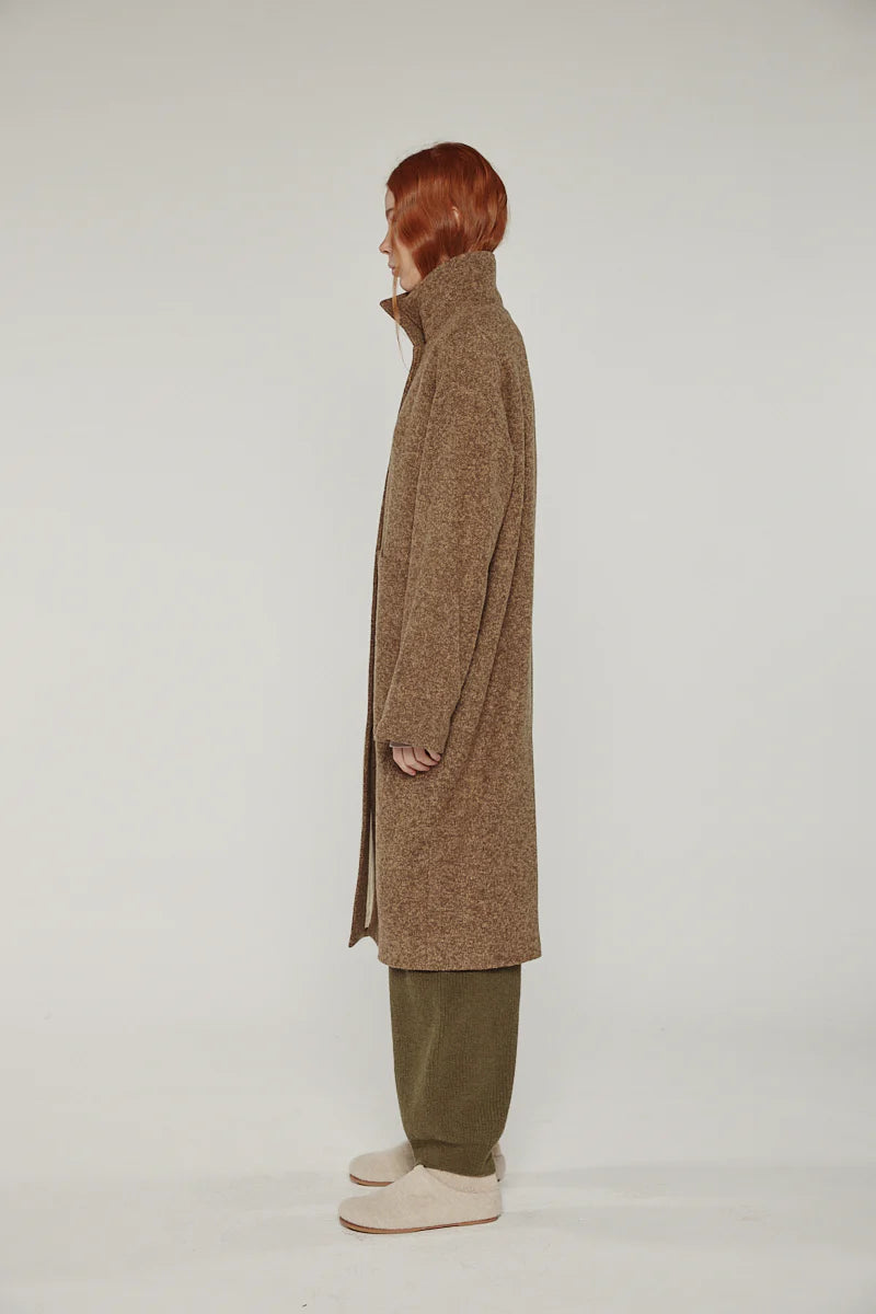 The clean construction is detailed with discreet pockets and concealed fastening, offering a refined look for the season. Featuring a soft cotton muslin lining in cream and a the perfect warm marled brown exterior.